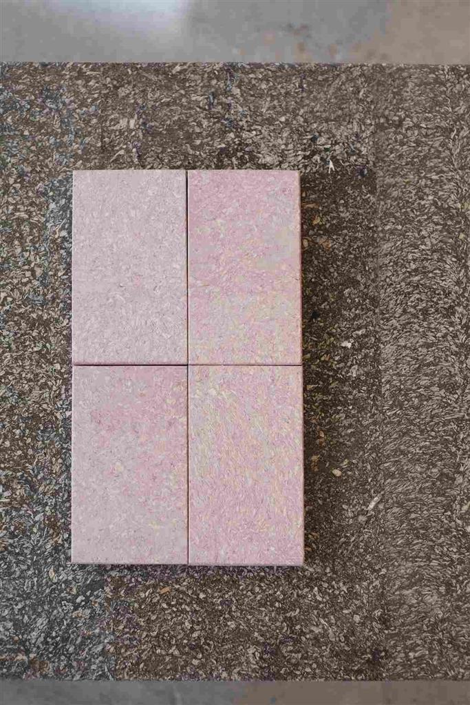 A defining feature of Cupsan is its visual and tactile richness. The natural composition produces subtle tonal variations, which can be enhanced through the addition of pigments, usually ochres, charcoal, or chalk. Blast Studio has even experimented with colouring the material using other waste streams, including brick dust to expand the range of aesthetic possibilities. In one striking example, red coffee cups from popular UK cafe chains such as Costa Coffee and Gail’s were repurposed without pigment, resulting in pastel pink panels that preserve the origin of their material story.